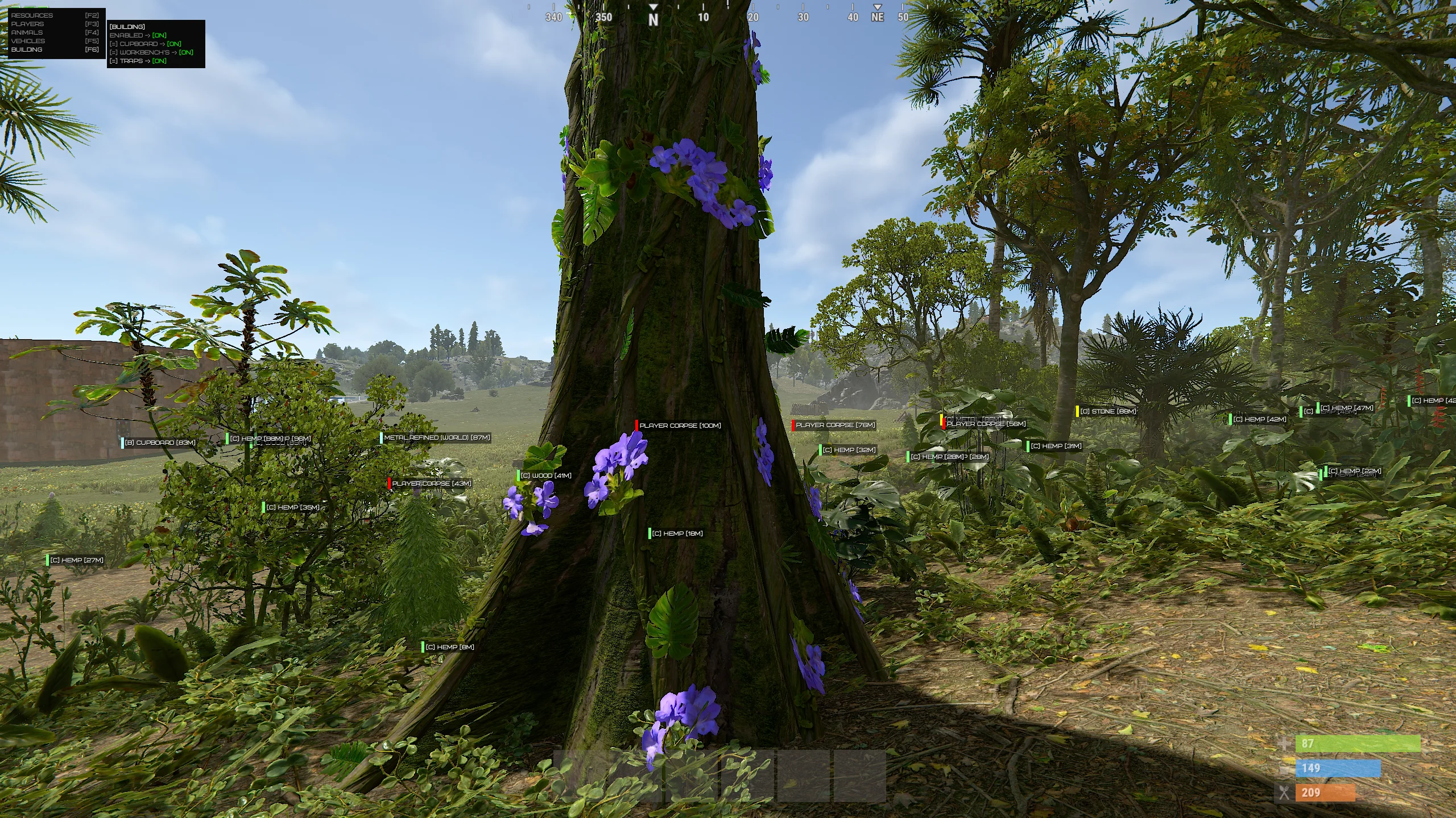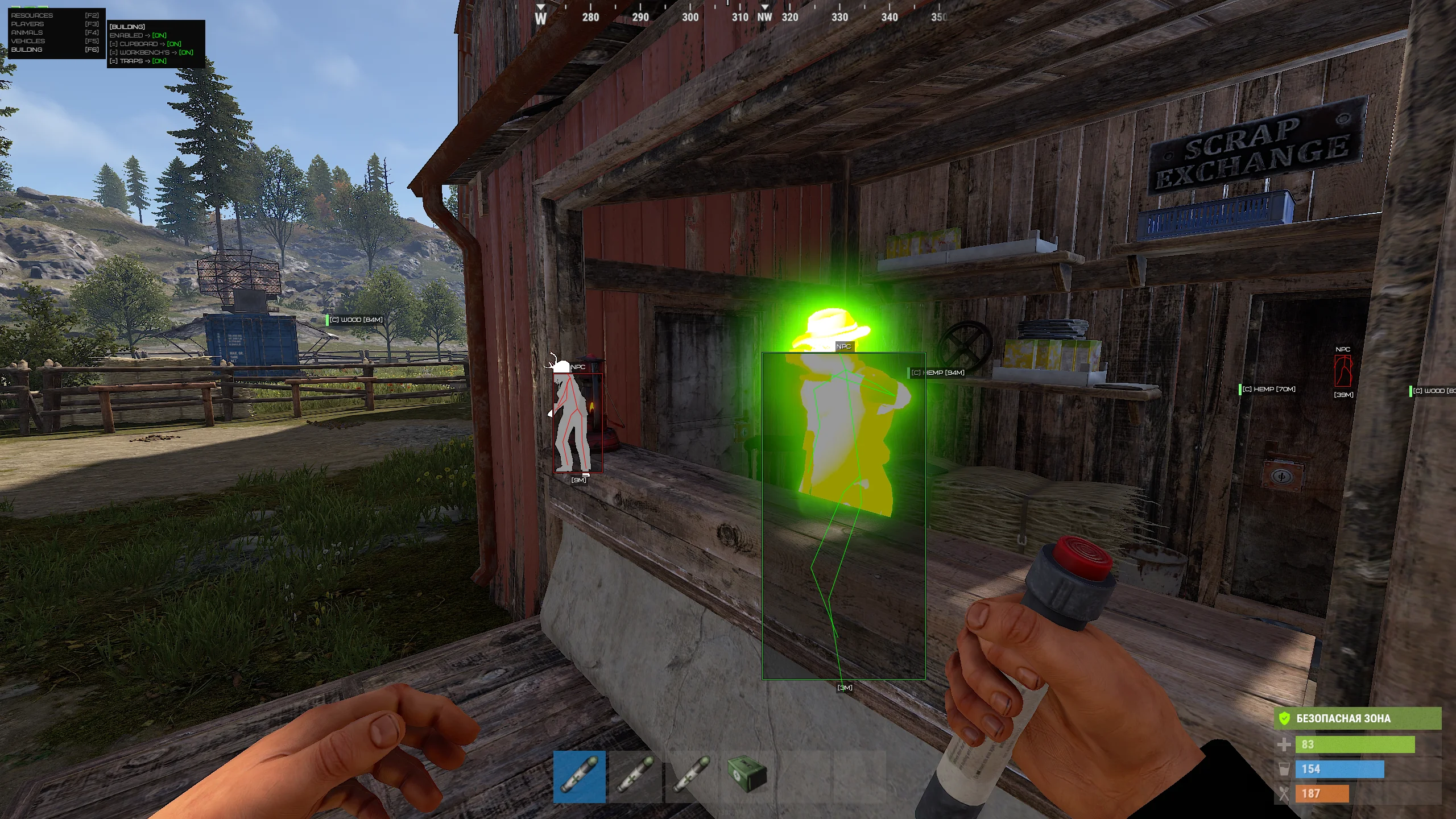 Building ESP highlights important base elements such as cupboards, workbenches, traps and key structures. This is especially useful during raids and reconnaissance, where every detail matters. The information is presented clearly without cluttering the interface, maintaining readability.